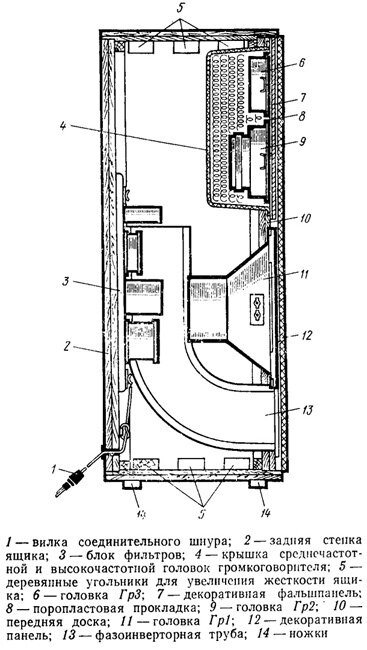 Конструкция была продуманной и передовой для своего времени. Для мощного и чистого баса использовалось фазоинверторное оформление, причём отверстие туннеля вынесли на переднюю панель для удобства размещения. Средне- и высокочастотные динамики разместили в отдельных изолированных камерах, чтобы подавить паразитные резонансы. В системе работали три динамические головки: 30ГД-1-25 (НЧ), 15ГД-11-120 (СЧ) и 10ГД-35-3000 (ВЧ).