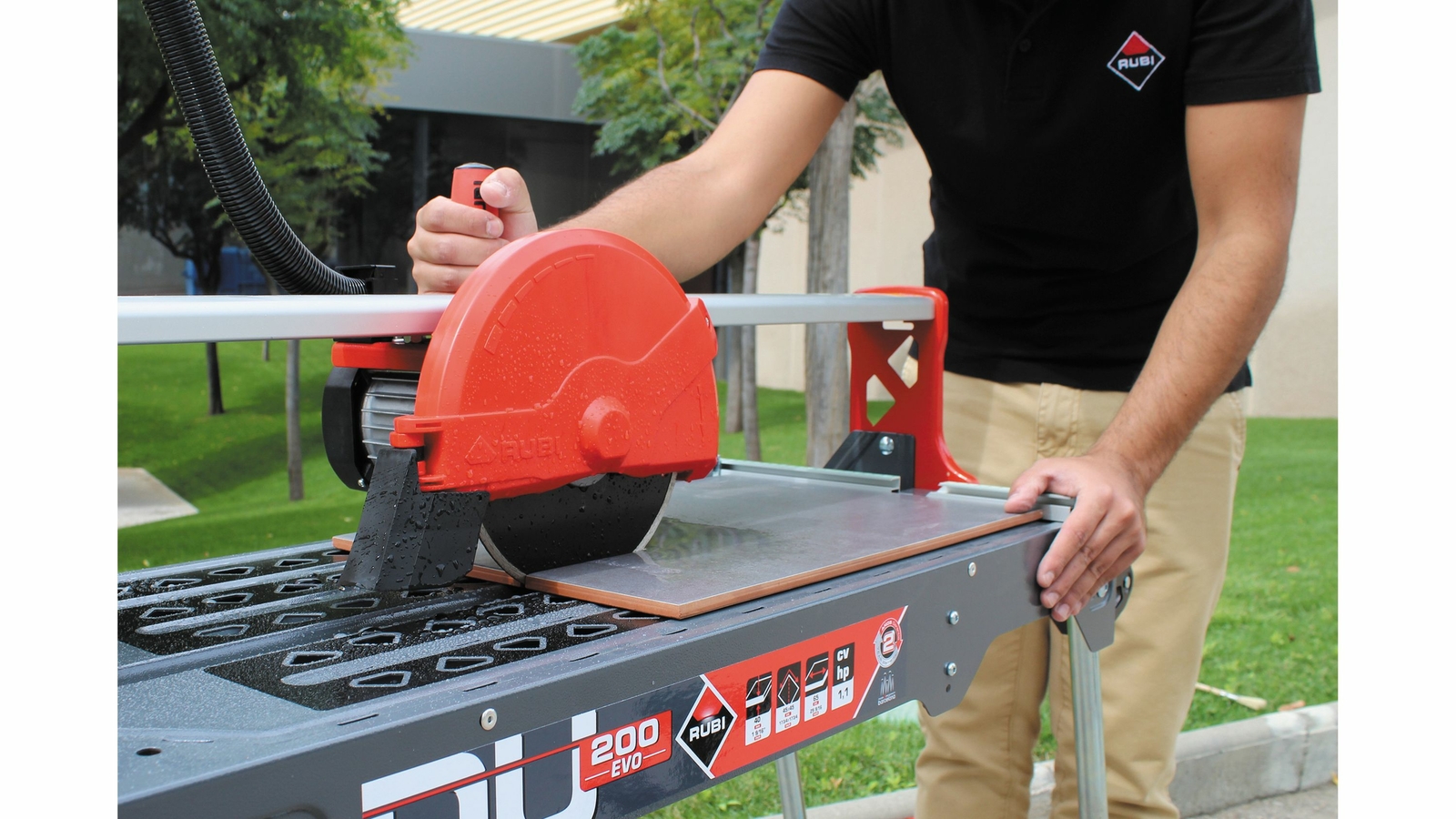 В классе «тяжелой артиллерии» для резки плитки с водяным охлаждением выделяется модель DU 200 EVO. Это производительная и при этом портативная машина. Благодаря складной станине её габариты в сложенном виде составляют 98.1×38.3×38.4 см, а вес – 23.5 кг, что упрощает транспортировку между объектами. С одной стороны платформы установлены колеса для удобного перемещения по помещению.