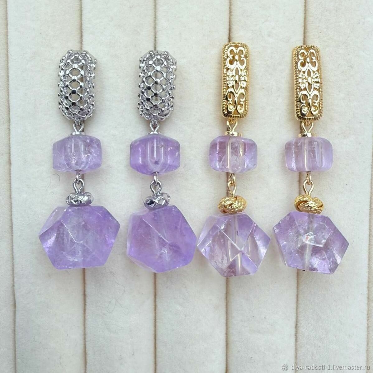 - Две бусины из натурального аметистового хрусталя с отверстием в верхней части.