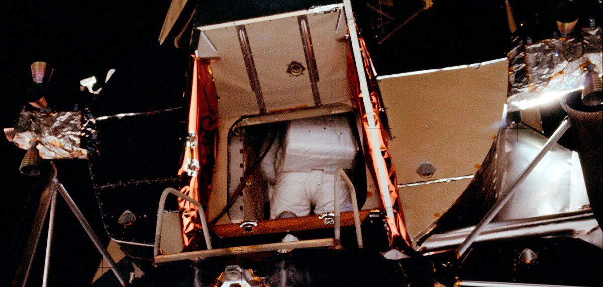 Астронавт в скафандре во время прохода в лунный модуль (иллюстрация НАСА)