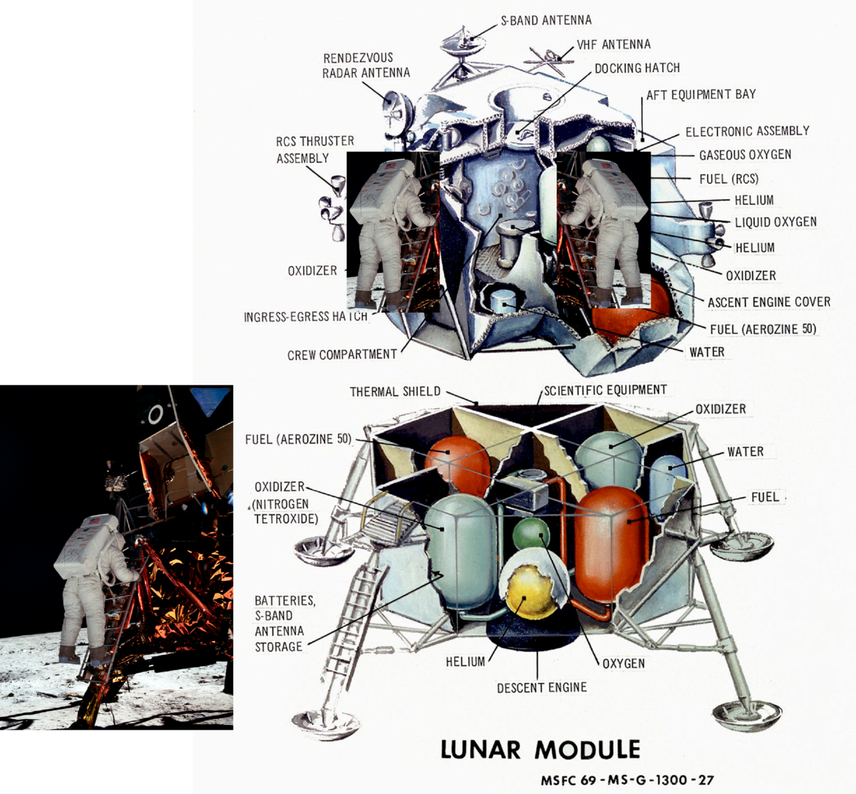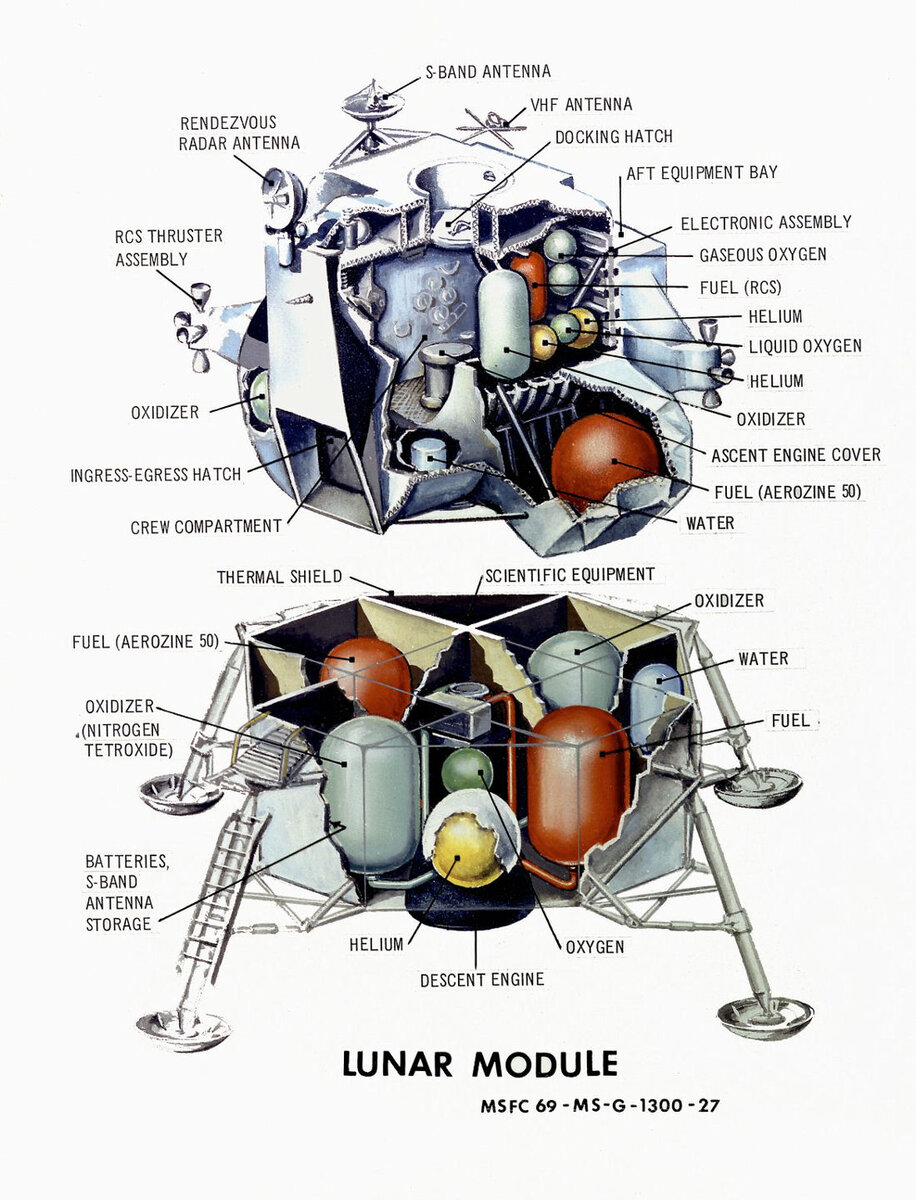На схеме отчётливо видна крошечная кабина, обозначенная как «CREW COMPARTMENT». Именно в этом «закутке» два астронавта должны были проводить всё время полёта к Луне, осуществлять сложнейшие манёвры прилунения, ночевать, справлять естественные нужды и готовиться к возвращению на орбиту. При этом им приходилось не сидеть, а стоять, так как места для сидений не было, и при этом управлять аппаратом.
