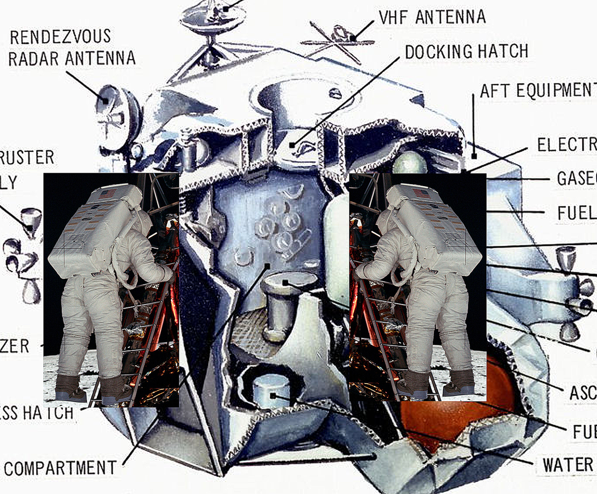 Для наглядности автор провёл масштабное сравнение. Он взял фотографию астронавта Эдвина Олдрина, спускающегося по трапу, и совместил её в одном масштабе со схемой командного отсека. Рядом он разместил зеркальное отражение этой фигуры, чтобы показать, как бы выглядели два астронавта рядом. Результат оказался поразительным: два человека в скафандрах элементарно не помещаются в отведённое для них пространство.