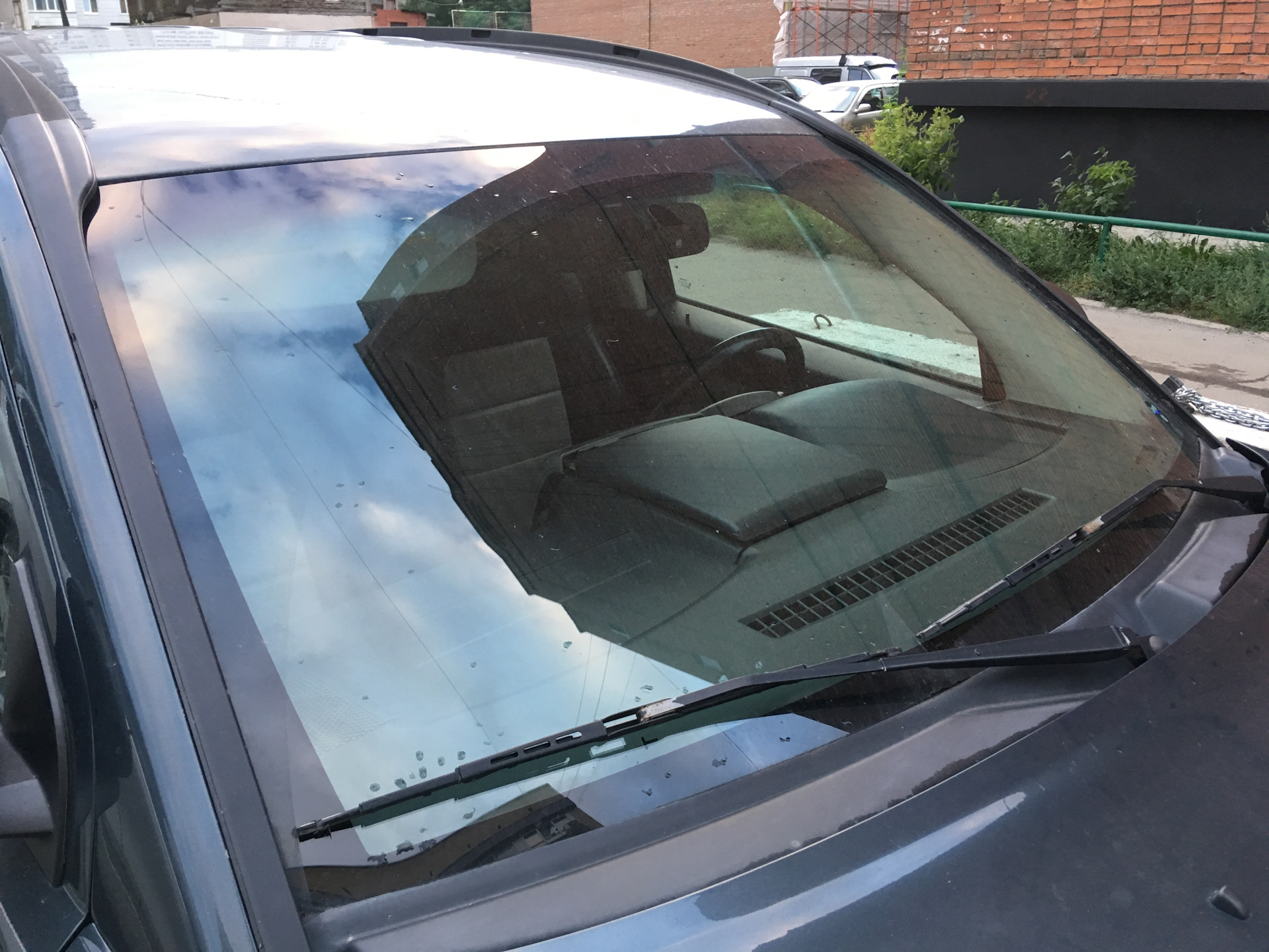 Вид на установленное стекло справаОбщая стоимость замены вместе с работой составила 6800 рублей, что очень бюджетно. В качестве бонуса сделали антидождевое покрытие («сухой туман»). За два года эксплуатации разницы с оригиналом не заметил, хотя со временем на стекле появились мелкие царапины от песка и пыли — в наших условиях, вероятно, оригинальное стекло выглядело бы так же.