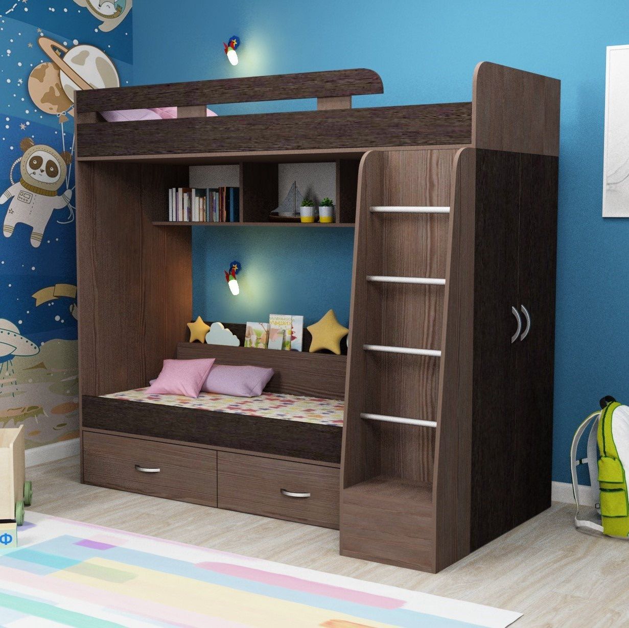 Доступ на второй ярус обеспечивает удобная лесенка, которая может быть выполнена в виде металлических перекладин или ступеней-ящиков. Есть модели со спальным местом наверху и шкафом с комодами внизу. Каждый вариант имеет свои положительные стороны. Перед покупкой учитывайте особенности детской, количество вещей, возраст ребенка.