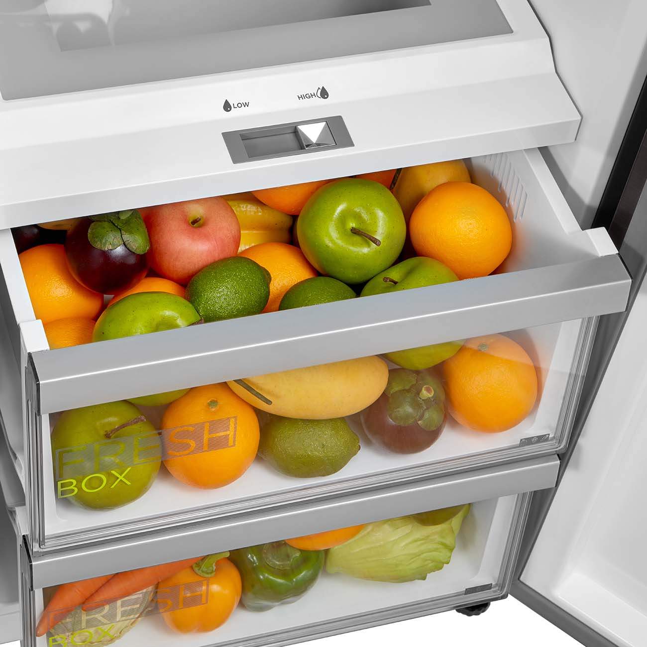 Организация пространства: 8 отделений: стеклянная полка, выдвижные корзины, большая корзина Big Box (вмещает до 14 кг), трансформируемые ёмкости Slim Space (можно использовать для пиццы), поддон для ягод.