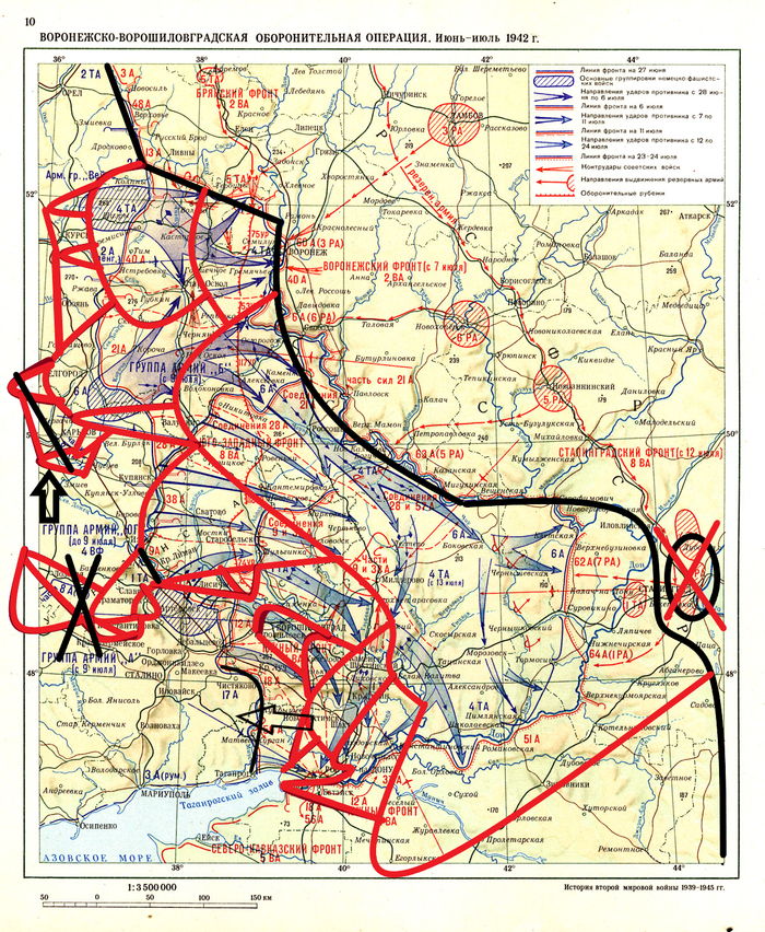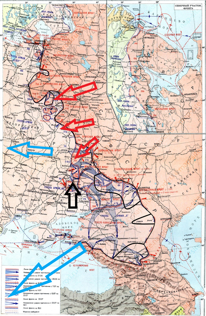 На картах красными стрелками обозначены основные удары советских войск, чёрными немецких и их союзников, голубыми направления основных событий на других театрах военных действий, жёлтыми границы отвоёванных территорий при наступлении той или другой стороны.