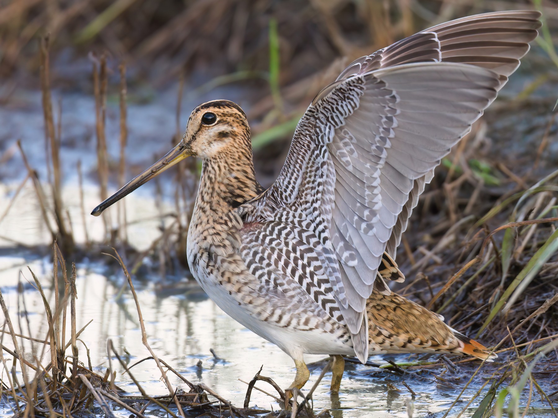 Японского бекаса легко узнать по характерному облику: компактное, плотное тело, очень длинный прямой клюв, относительно короткие ноги и маскирующая окраска оперения, которая идеально скрывает птицу в траве. Длина тела достигает 33 см, а вес — от 150 до 230 граммов. Половой диморфизм выражен слабо, хотя у самок клюв, как правило, длиннее.